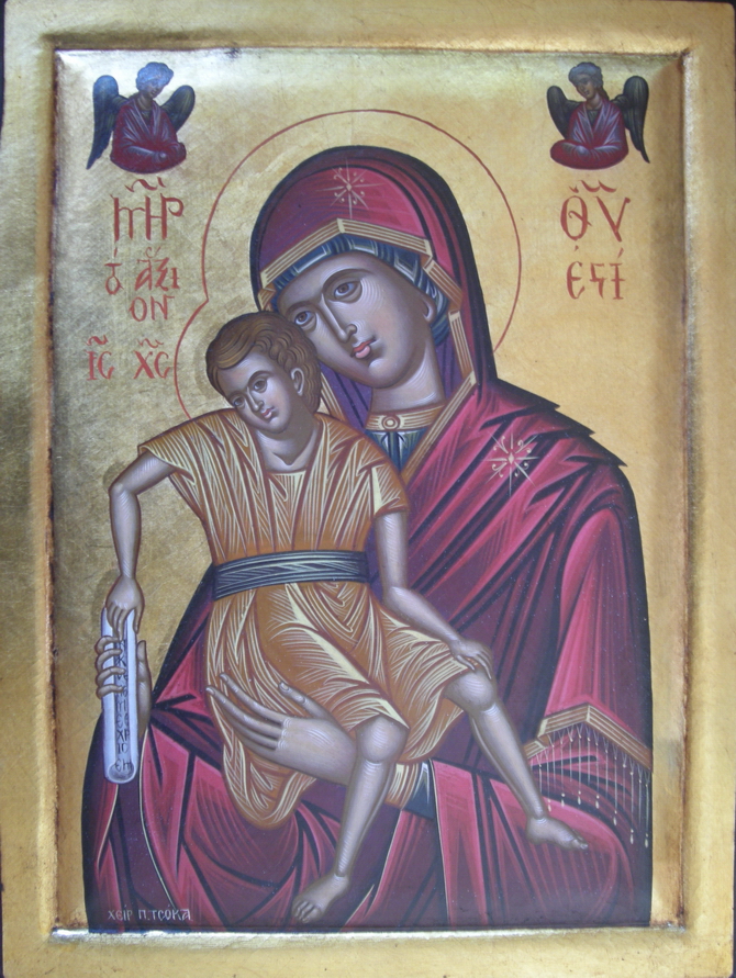 Αυγοτέμπερα, 22κ χρυσό, καμβάς πάνω σεεξαιρετικής ποιότητας ξύλο φλαμουριάς.Αντίγραφο της Ιερής Εικόνας που βρίσκεται στις Καρυές, στο Αγιον Ορος.