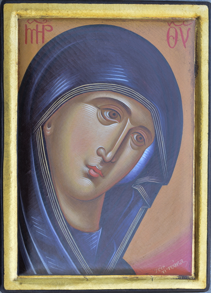 Αυγοτέμπερα, 22κ χρυσό, καμβάς πάνω σεεξαιρετικής ποιότητας ξύλο φλαμουριάς.Αντίγραφο εικόνας από την Μονή Βατοπεδίου.