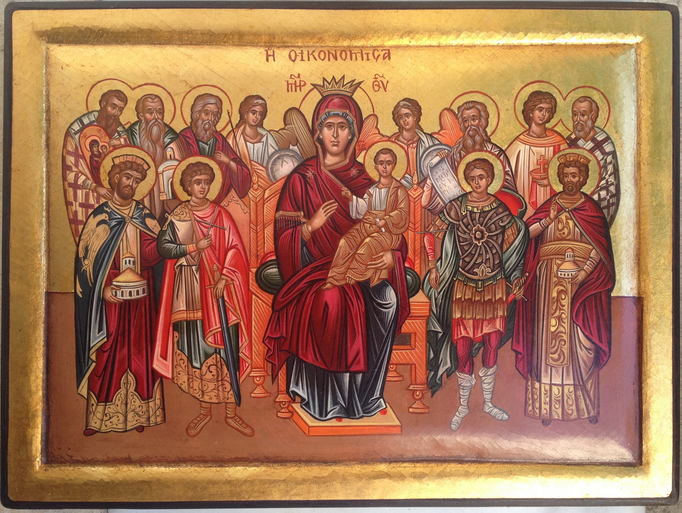 Αυγοτέμπερα, 22κ χρυσό, καμβάς πάνω σε εξαιρετικήςποιότητας ξύλου φλαμουριάς. Αντίγραφο της Ιερής Εικόναςτης Μονής Βατοπεδίου στο Αγιον Ορος